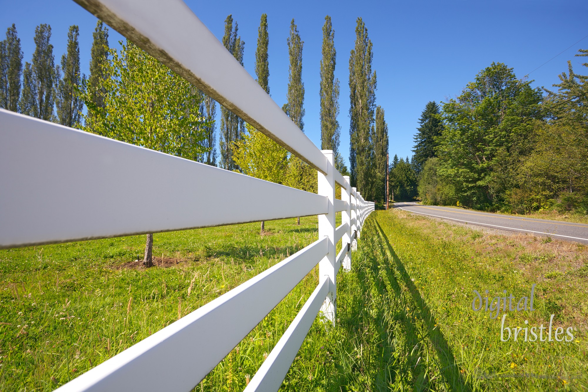 - Country Road, Farm, Fence, Field, Grass, Green, King County, Non-Urban Scene, Pacific Northwest, Pasture, Poplar Tree, Rail Fence, Road, Roadside, Rural Scene, Summer, Sunlight, Tree, Washington State, White, horizontal, nobody, outdoors