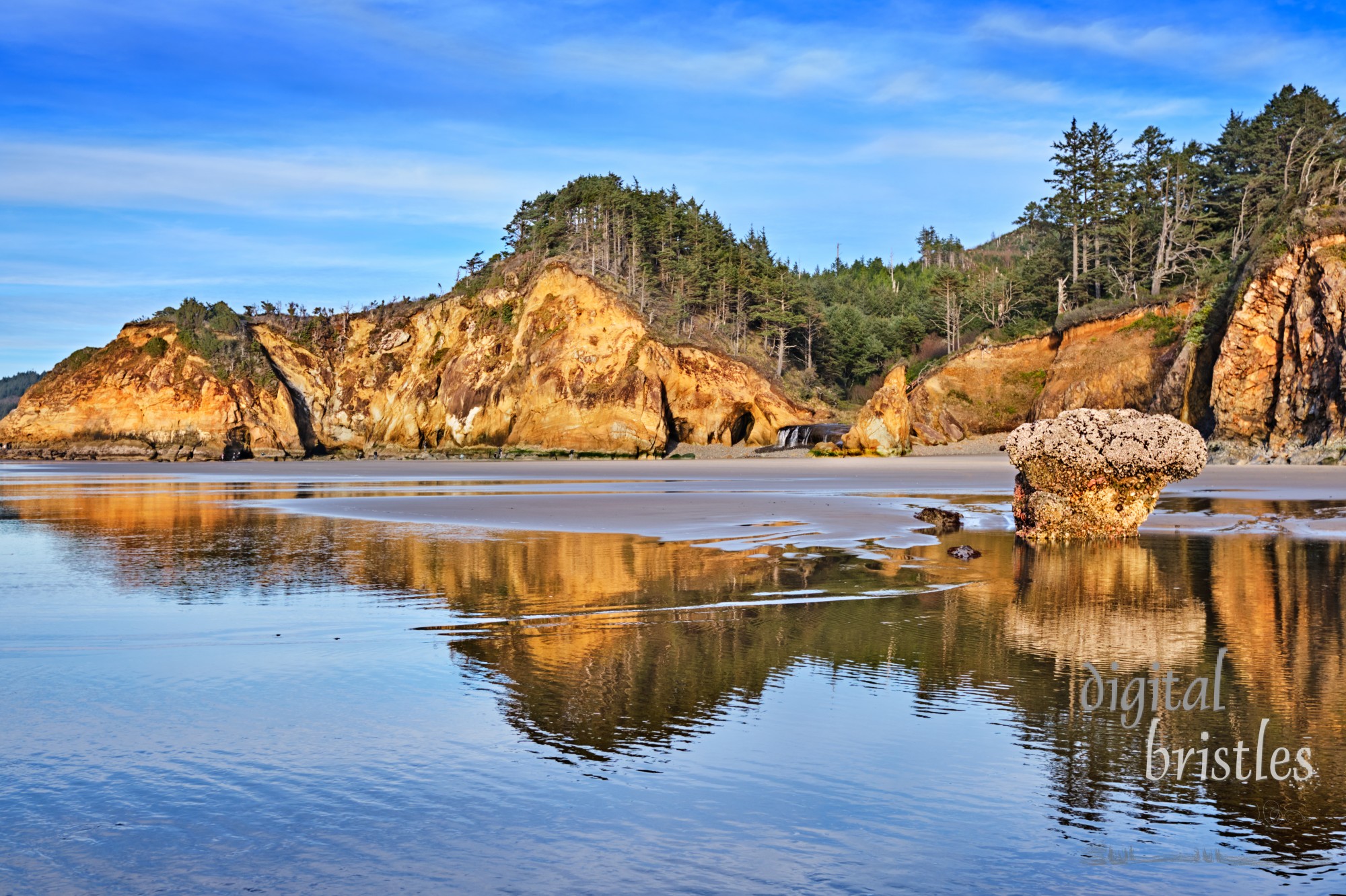 - beach, Hug Point, reflections, low tide, afternoon, barnacles, tide pools, sea star, coastline, Oregon, cliffs, caves, sand, waterfall, water, rocks, pebbles, trees, erosion, shingle, pacific, blue sky, clouds, sunny, Arch Cape, Clatsop County, Pacific Northwest, Winter, sea, ocean, tourism