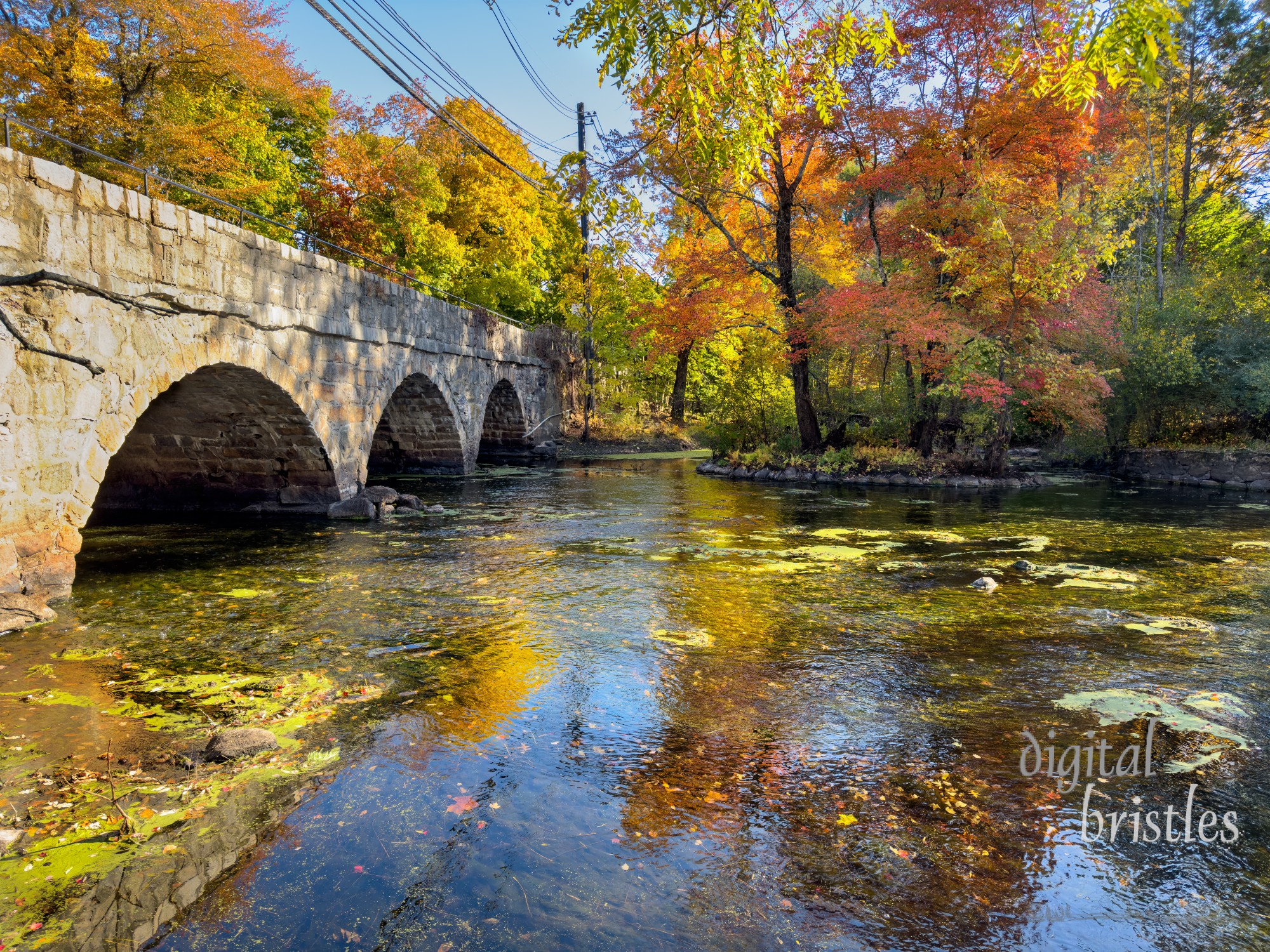 river, bridge, island, trees, sunny, fall, colors, park, Natick, water, arches, stone, autumn, red, orange, yellow, green, leaves, reflections, South Natick Dam Park, Pleasant Street, wires, riverbank, Massachusetts, New England, outdoors, outside, nobody