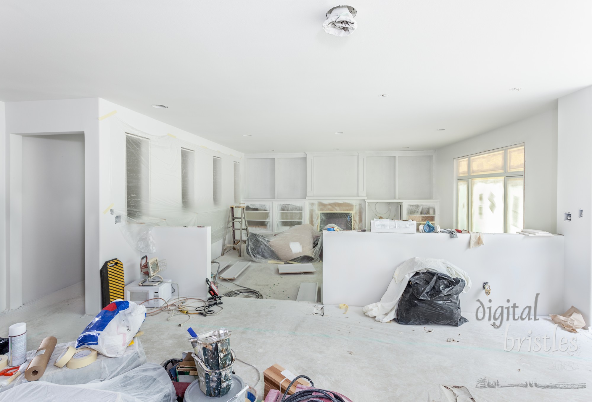 - remodel, remodeling, family room, painting, plastic, tape, paper, preparation, protection, covering, masking, primer, electrical, covering, windows, spray, white, mess, house, home, interior, indoors, rough in, trash bag, tools, ladder