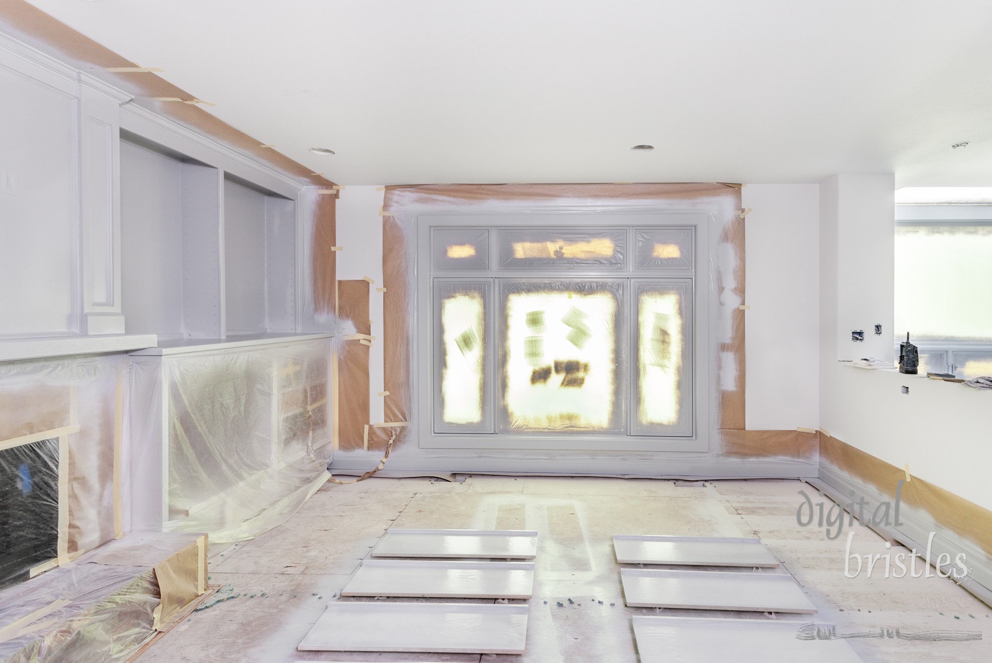 - remodel, remodeling, family room, trim, shelves, fireplace, painting, plastic, tape, paper, preparation, protection, covering, masking, electrical, covering, windows, spray, white, mess, house, home, interior, indoors