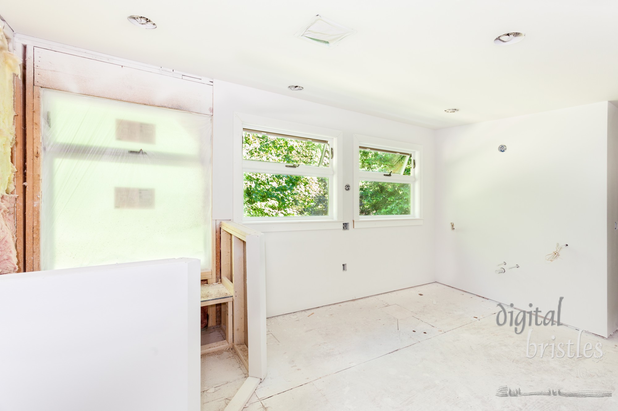 - remodel, remodeling, house, home, interior, indoors, window casing, MDF, plywood, sunny, plastic sheet, priming, bathroom, master bathroom, window, progress, rough in, electrical, pipes, framing, insulation